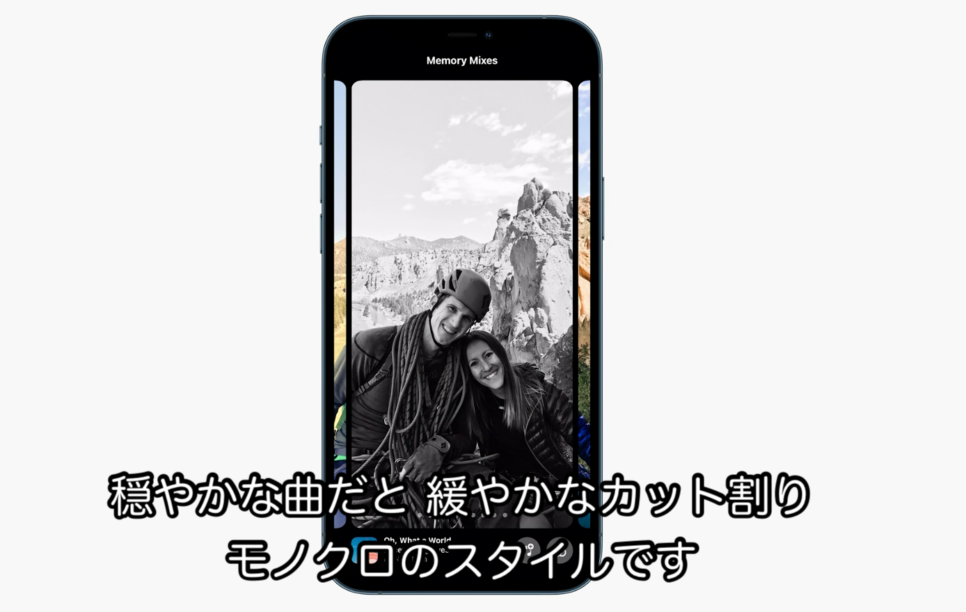 新機能のメモリーミックスでメモリーをカスタマイズできるように。 メモリーミックスで最適な曲やテンポや見た目を選んでくれる(スワイプでテーマを切り替えているように見える)。